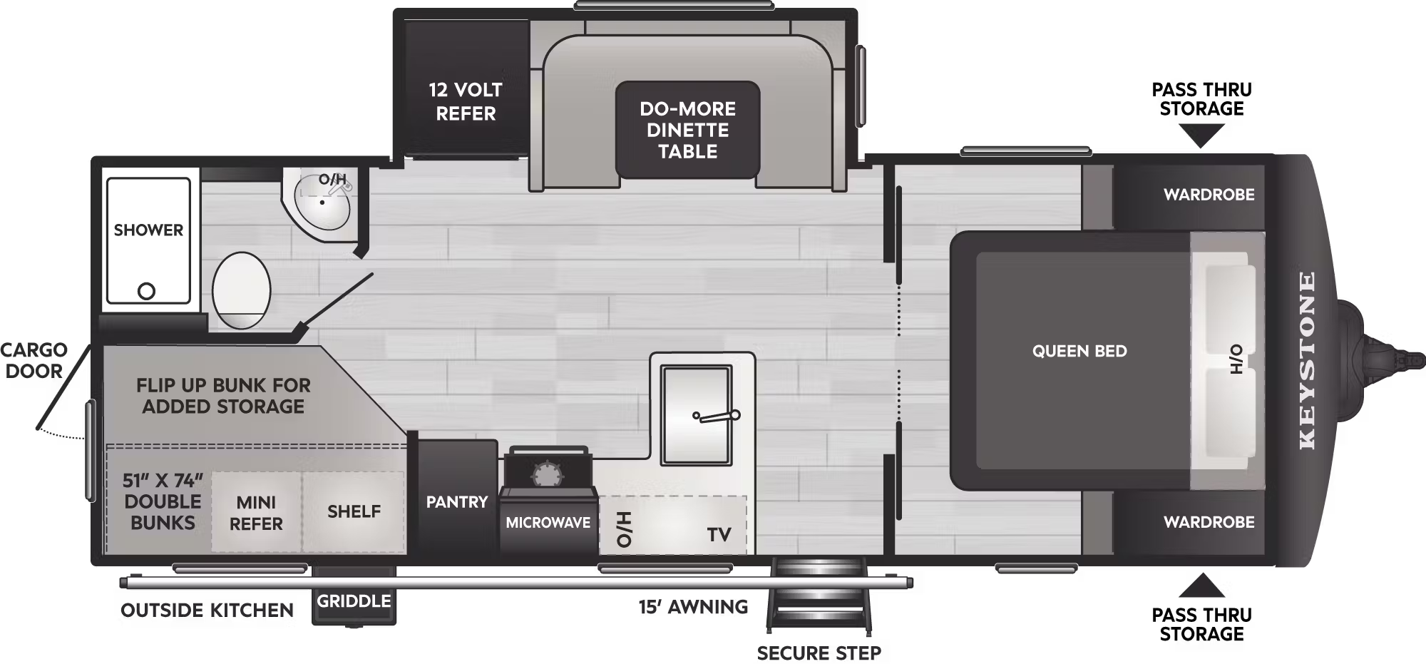 EXTERIOR: Power tongue jack 80% Tinted safety glass windows 40' Spray House Edge Lighting Exterior Front Edge Lighting Exterior Rear High Impact Thermoset Resin Painted Front Cap Fully walkable roof Rear ladder BAL Accuslide cable slideout system w/ manual override One-piece polypropylene underbelly Dexter® Torsion Axle rubber ride suspension with 10 year warranty Goodyear Endurance Tires Rear accessory hitch Power stabilizer jacks 26" X 74" Main entrance door w/ deadbolt Solid Entry Steps Extra large 30" X 20" baggage doors w/ motion sensor lighting in pass-thru Exterior convenience center 54 gal. fresh, 38 gal. black and 38 gal. grey Outdoor kitchen w/ griddle cooktop and mini-refer 110 outlets Outside shower w/ hot and cold Engineered specifically for each floor plan INTERIOR: Residential durable Beauflor® vinyl flooring Deluxe night shades Upgraded residential window treatments and valances KEYSTONE EXCLUSIVES: 3-year limited structural warranty 1-year limited base warranty Color-coded unified wiring standard 4G LTE and Wi-Fi prep Tuf-Lok™ thermoplastic duct joiners KeyTV™ multisource signal controller Tru-fit™ slide construction Hyper Deck™ Flooring Giggy Box - Battery disconnect KITCHEN FEATURES: Seamless kitchen countertops Black Stainless Steel Farm Sink Waterfall Pull Down Kitchen Faucet U-Shaped dinette Do-More Dinette APPLIANCES & UTILITIES: (2) 20 lb. propane bottles w/ flip-top cover 13.5K BTU A/C 30K BTU Furnace Girard Tankless Water Heater 12V SMART TV w/ FM stereo, AUX input, Bluetooth® and quality sound speakers 10 cu ft double-door 12V refer Combo Air Fryer, Microwave, Convection w/ carousel 3-Burner, high output range w/ glass-top & oven Line Lite Interior Lights + Dimmer Main Living Space Interior control center BEDROOM FEATURES: Residential 60"x80" Queen mattress Reading lights Bedside outlets/USB - USB-C Decorative bedspread TV hook-up BATHROOM FEATURES: Residential-style bathroom countertops Skylight above every shower and tub Premium Porcelin Foot-flush toilet WEATHER PROTECTION: Heated and enclosed underbelly Extended Season Camping Thermal Package SAFETY: Breakaway switch and safety chains GFI receptacles Carbon monoxide detector Smoke detector Propane gas leak detector Fire extinguisher