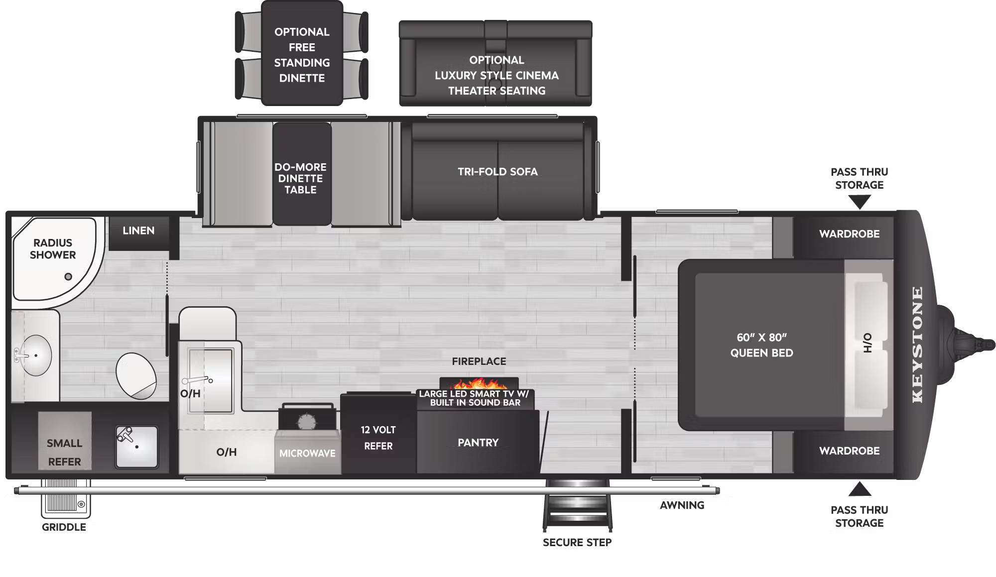 EXTERIOR: Power tongue jack 80% Tinted safety glass windows 40' Spray House Edge Lighting Exterior Front Edge Lighting Exterior Rear High Impact Thermoset Resin Painted Front Cap Fully walkable roof Rear ladder BAL Accuslide cable slideout system w/ manual override One-piece polypropylene underbelly Dexter® Torsion Axle rubber ride suspension with 10 year warranty Goodyear Endurance Tires Rear accessory hitch Power stabilizer jacks 26" X 74" Main entrance door w/ deadbolt Solid Entry Steps Extra large 30" X 20" baggage doors w/ motion sensor lighting in pass-thru Exterior convenience center 54 gal. fresh, 30 gal. black and 60 gal. grey 54 gal. fresh, 38 gal. black and 76 gal. grey Outdoor kitchen w/ griddle cooktop and mini-refer 110 outlets Outside shower w/ hot and cold Engineered specifically for each floor plan INTERIOR: Residential durable Beauflor® vinyl flooring Deluxe night shades Upgraded residential window treatments and valances 68" Tri-Fold Sofa Luxury L Shaped Sofa with Ottomans Fireplace KEYSTONE EXCLUSIVES: 3-year limited structural warranty 1-year limited base warranty Color-coded unified wiring standard 4G LTE and Wi-Fi prep Tuf-Lok™ thermoplastic duct joiners KeyTV™ multisource signal controller Tru-fit™ slide construction Hyper Deck™ Flooring Giggy Box - Battery disconnect KITCHEN FEATURES: Seamless kitchen countertops Black Stainless Steel Farm Sink Waterfall Pull Down Kitchen Faucet Do-More Dinette APPLIANCES & UTILITIES: (2) 20 lb. propane bottles w/ flip-top cover 13.5K BTU A/C 30K BTU Furnace Girard Tankless Water Heater 12V SMART TV w/ FM stereo, AUX input, Bluetooth® and quality sound speakers 10 cu ft double-door 12V refer Combo Air Fryer, Microwave, Convection w/ carousel 3-Burner, high output range w/ glass-top & oven Line Lite Interior Lights + Dimmer Main Living Space Interior control center BEDROOM FEATURES: Residential 60"x80" Queen mattress Reading lights Bedside outlets/USB - USB-C Decorative bedspread TV hook-up BATHROOM FEATURES: Residential-style bathroom countertops Skylight above every shower and tub Premium Porcelin Foot-flush toilet WEATHER PROTECTION: Heated and enclosed underbelly Extended Season Camping Thermal Package SAFETY: Breakaway switch and safety chains GFI receptacles Carbon monoxide detector Smoke detector Propane gas leak detector Fire extinguisher