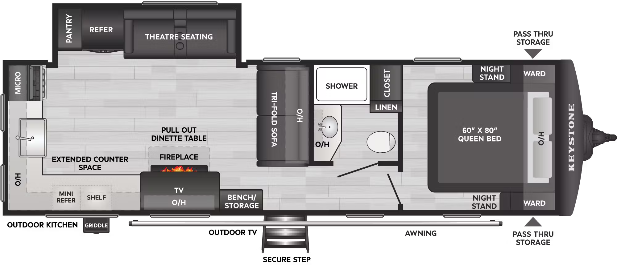EXTERIOR: Power tongue jack 80% Tinted safety glass windows 40' Spray House Edge Lighting Exterior Front Edge Lighting Exterior Rear High Impact Thermoset Resin Painted Front Cap Fully walkable roof Rear ladder BAL Accuslide cable slideout system w/ manual override One-piece polypropylene underbelly Dexter® Torsion Axle rubber ride suspension with 10 year warranty Goodyear Endurance Tires Rear accessory hitch Power stabilizer jacks 26" X 74" Main entrance door w/ deadbolt Solid Entry Steps Extra large 30" X 20" baggage doors w/ motion sensor lighting in pass-thru Exterior convenience center 54 gal. fresh, 38 gal. black and 76 gal. grey Outdoor kitchen w/ griddle cooktop and mini-refer 110 outlets Outside shower w/ hot and cold Engineered specifically for each floor plan INTERIOR: Residential durable Beauflor® vinyl flooring Deluxe night shades Upgraded residential window treatments and valances Theatre seating 68" Tri-Fold Sofa Luxury L Shaped Sofa with Ottomans Fireplace KEYSTONE EXCLUSIVES: 3-year limited structural warranty 1-year limited base warranty Color-coded unified wiring standard 4G LTE and Wi-Fi prep Tuf-Lok™ thermoplastic duct joiners KeyTV™ multisource signal controller Tru-fit™ slide construction Hyper Deck™ Flooring Giggy Box - Battery disconnect KITCHEN FEATURES: Seamless kitchen countertops Black Stainless Steel Farm Sink Waterfall Pull Down Kitchen Faucet APPLIANCES & UTILITIES: (2) 20 lb. propane bottles w/ flip-top cover 13.5K BTU A/C 30K BTU Furnace Girard Tankless Water Heater 12V SMART TV w/ FM stereo, AUX input, Bluetooth® and quality sound speakers 10 cu ft double-door 12V refer Combo Air Fryer, Microwave, Convection w/ carousel 3-Burner, high output range w/ glass-top & oven Line Lite Interior Lights + Dimmer Main Living Space Interior control center BEDROOM FEATURES: Residential 60"x80" Queen mattress Reading lights Bedside outlets/USB - USB-C Decorative bedspread TV hook-up BATHROOM FEATURES: Residential-style bathroom countertops Skylight above every shower and tub Premium Porcelin Foot-flush toilet WEATHER PROTECTION: Heated and enclosed underbelly Extended Season Camping Thermal Package SAFETY: Breakaway switch and safety chains GFI receptacles Carbon monoxide detector Smoke detector Propane gas leak detector Fire extinguisher